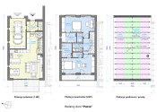 Prvé podlažie pozostáva z dennej časti domu a garáže. Zo zádveria je prístup do chodby a do otvoreného spoločenského priestoru tvoreného obývacou izbou, jedálňou a kuchyňou, ako aj k schodisku na 2.NP. Medzi obývacou izbou a schodiskom je umiestnený krb. Z jedálne a obývacej izby je prístup na terasu a do záhrady.