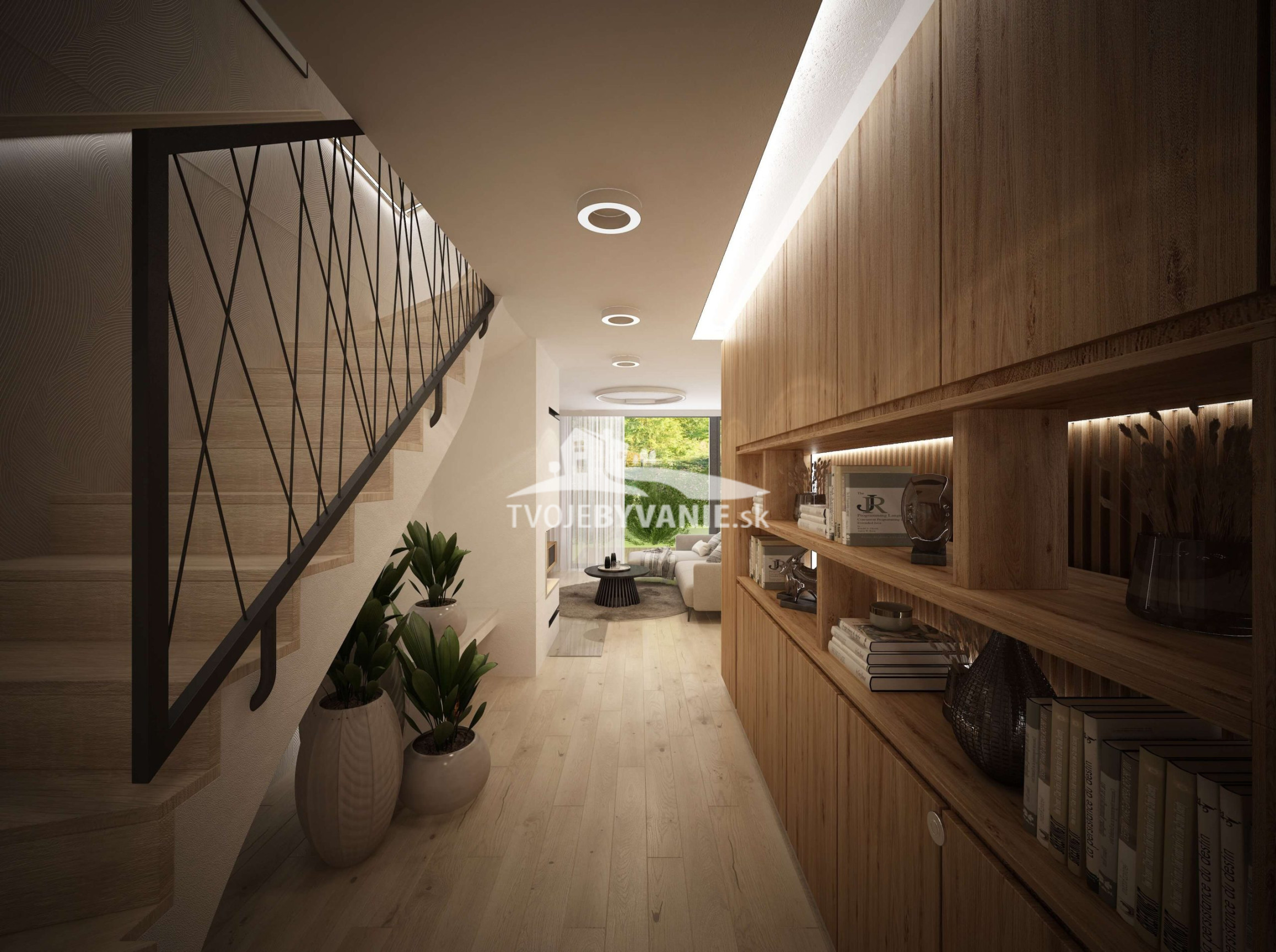 Prvé podlažie pozostáva z dennej časti domu a garáže. Zo zádveria je prístup do chodby a do otvoreného spoločenského priestoru tvoreného obývacou izbou, jedálňou a kuchyňou, ako aj k schodisku na 2.NP. Medzi obývacou izbou a schodiskom je umiestnený krb. Z jedálne a obývacej izby je prístup na terasu a do záhrady.